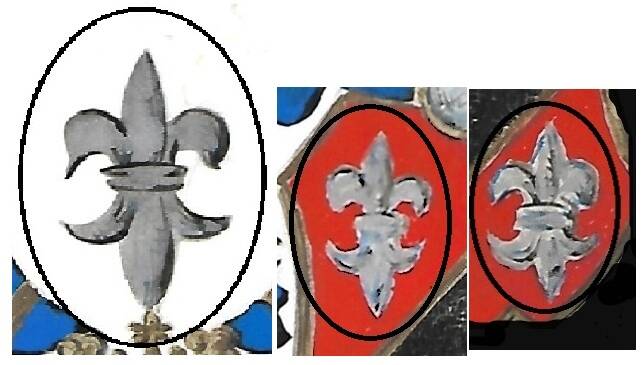 In der Mitte oben findet sich eine Schwertlilie (Fleur-de-lis); diese findet sich noch zwei mal im Schild.
